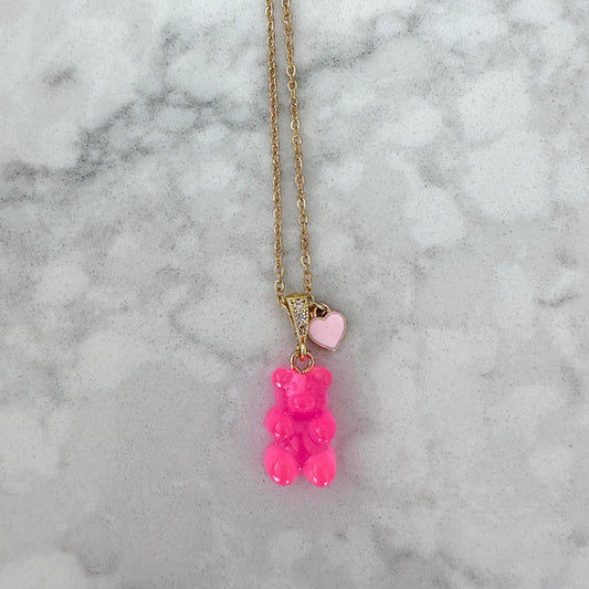 Neon Pink Signature Jelly Bear Heart Necklace