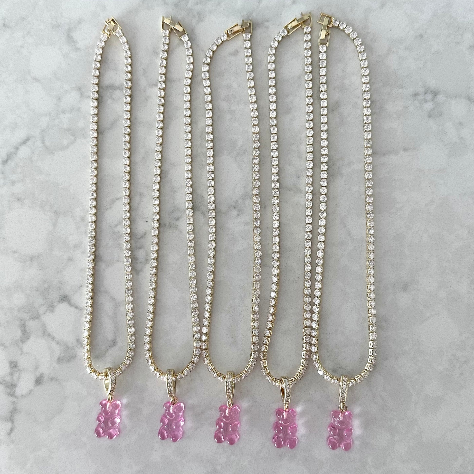 'La Jelly' Transluscent Pink Bear Crystal Tennis Necklace