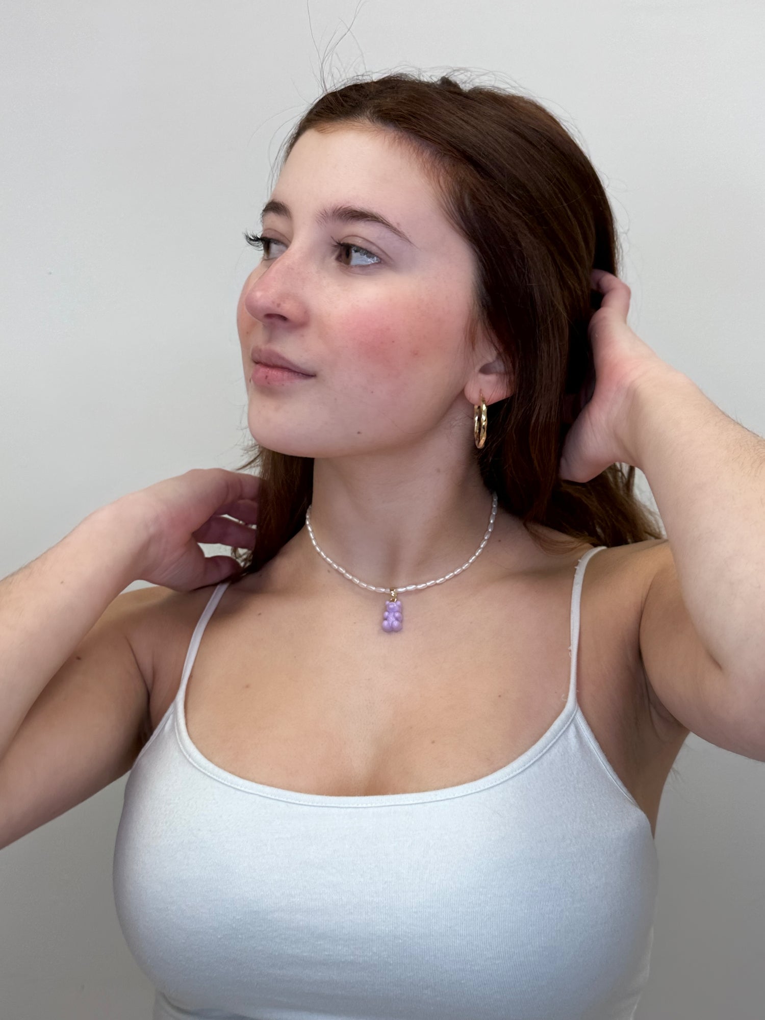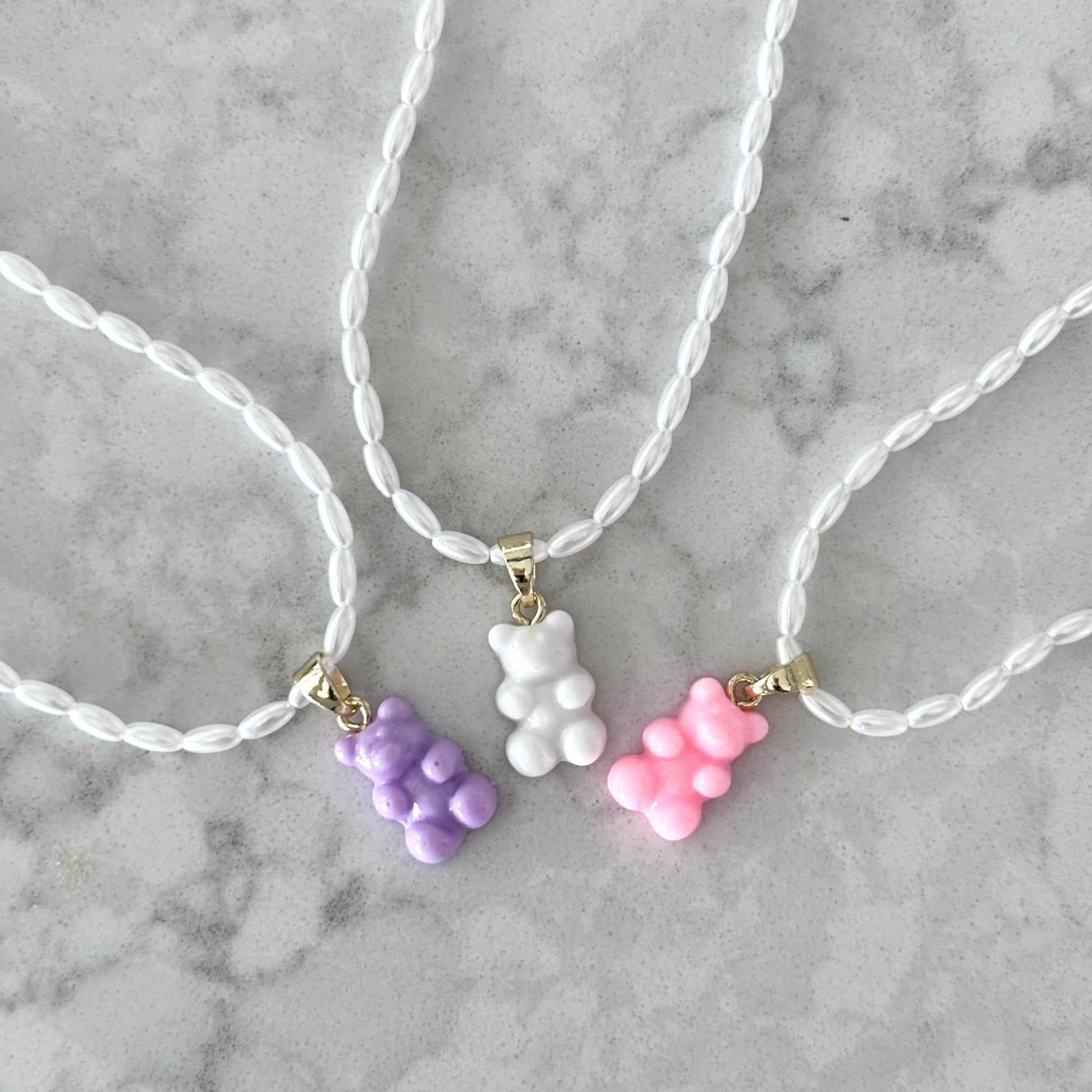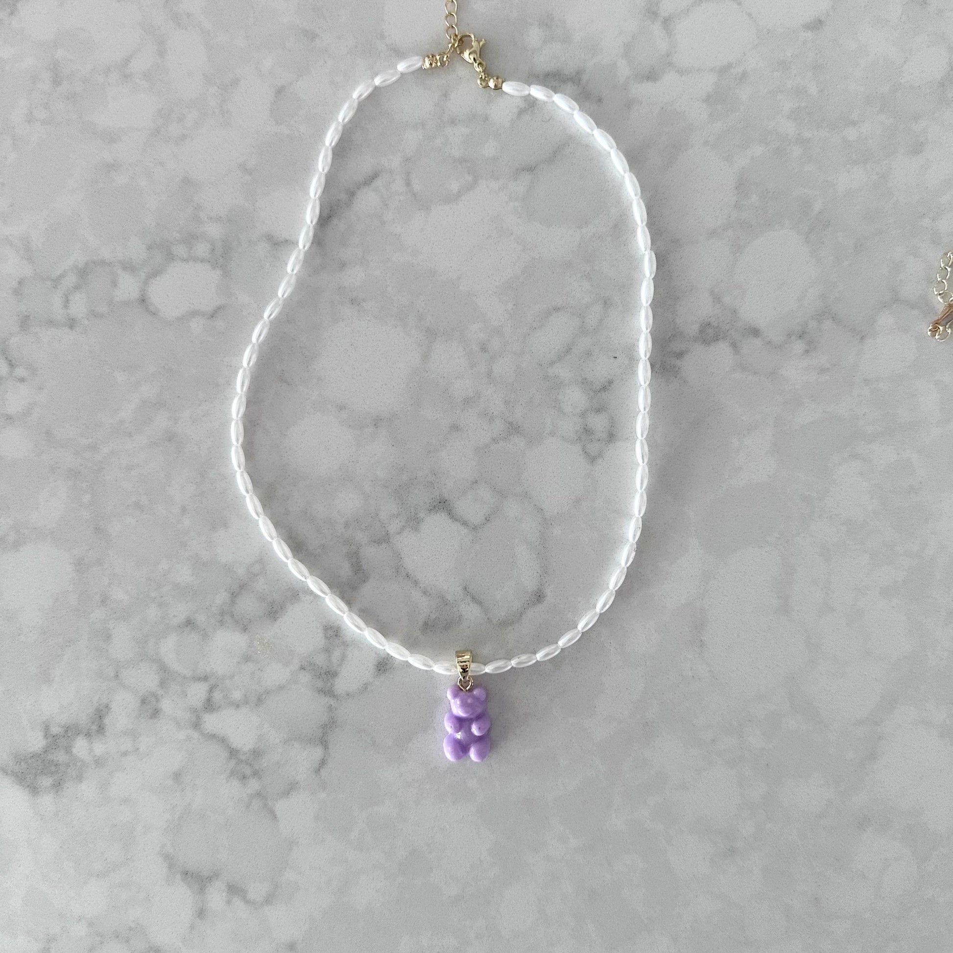 Resin bear charm on simple gold-plated pendant. Matte pearl chain.